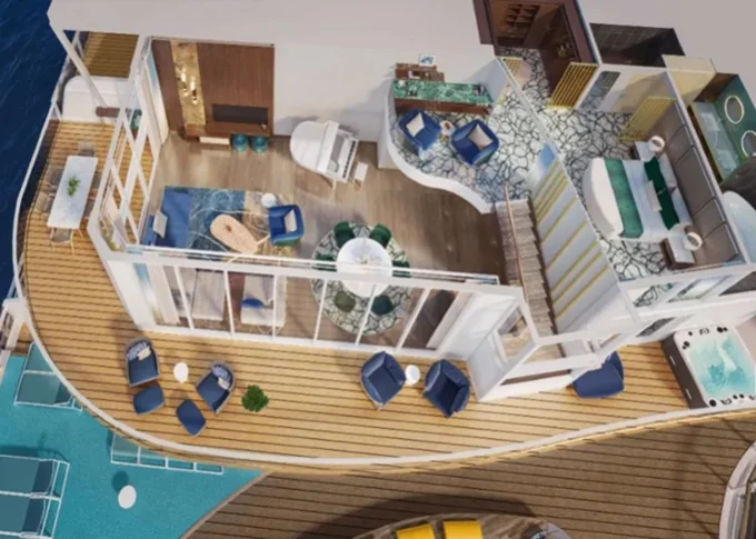 UL - Ultimate Family Townhouse 3-podlažný apartmán. 165 m² + 38 a 23 m² balkóny s výhľadom na more. 7. až 9. paluba vzadu. Max 8 osôb. Výhody Royal Suite Star class. 55 922 € 27 961 € za osobu