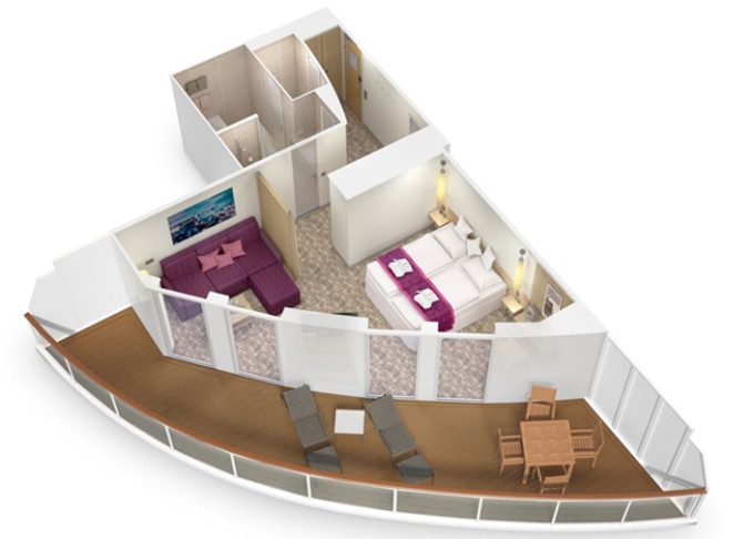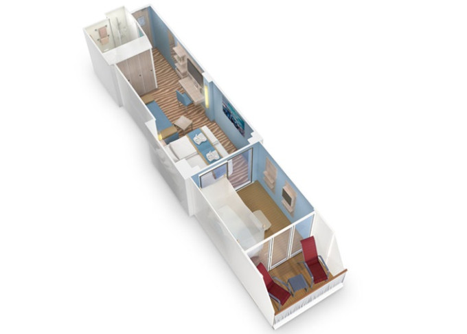 JA - Junior-Suite s balkónom PREMIUM 34 m² + terasa 27,5 m². 8. až 15. paluba. Max 4 osoby. Cenový model Premium + výhody Junior Suite. 6 190 € 3 095 € za osobu