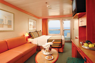 • Ubytovanie v kajute vybranej kategórie. Základné vybavenie: kúpeľňa s WC a sprchovacím kútom, 2 lôžka spojiteľné do manželskej postele, skrine, nočné stolíky, toaletný stolík a stolička, nastaviteľná klimatizácia, interaktívna satelitná TV s plochou obrazovkou, trezor, sušič na vlasy, uteráky a posteľné prádlo, Wi-Fi pripojenie (za poplatok), 24/7 kajutová služba (za poplatok).