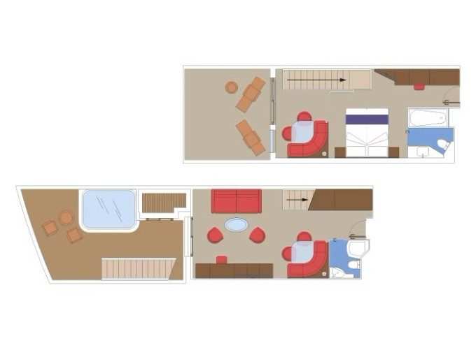 | YCD - Yacht Club Duplex Suite 46 m² + balkón 6 m². 2 podlažia, 2 kúpeľne (1 s vaňou) Max 4 osoby. 16. paluba. Cenový model MSC Yacht Club. | 7 502 € 3 751 € za osobu | ||
