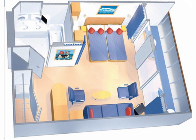 1K - Veľká vonkajšia kajuta Ultra Spacious 24,5 m². Neotvárateľné okno. Oddelená časť s poschodovou posteľou. Max. 5-6 osôb. 3 048 € 762 € za osobu