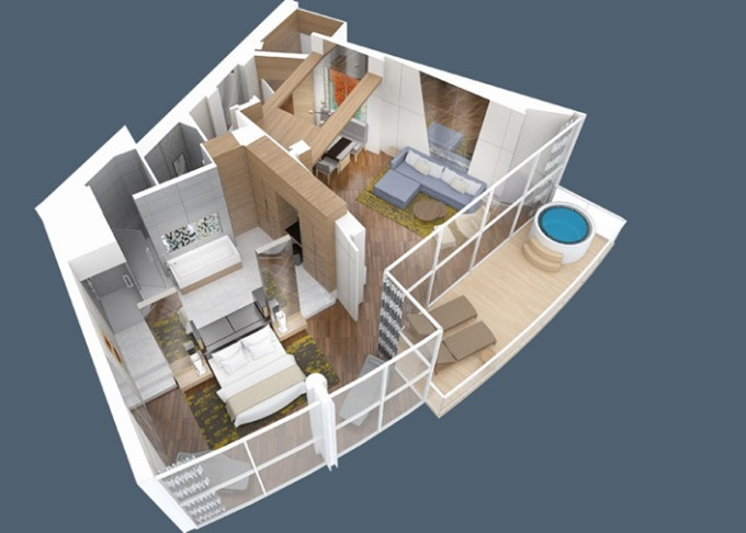 UP - Ultimate Panoramic Suite 85 m². Veľké panoramatické okná. 14. paluba. Max 4 osoby. Výhody Royal Suite Star Class. 19 482 € 9 741 € za osobu