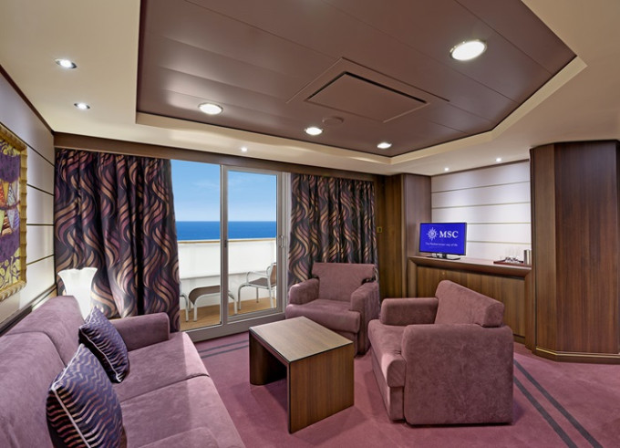 Suite s balkónom/panoramatickým oknom: cca32 m², (Royal, Family, Aurea 47-52m²) kajuta s manželskou posteľou (na požiadanie 2 oddelené postele) a rozkladacia pohovka. Klimatizácia, kúpeľňa s vaňou, toaletný stolík, priestorná skriňa, interaktívna TV, telefón, minibar, sejf, sušič na vlasy. Balkón so stolíkom a stoličkami alebo panoramatické okno. Internetové pripojenie (za poplatok).