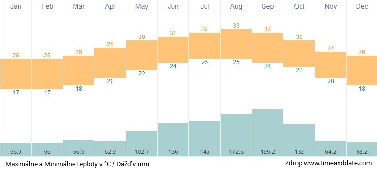 Teplota mora: od 24 °C (január - február) až po 29.8 °C (júl - august).